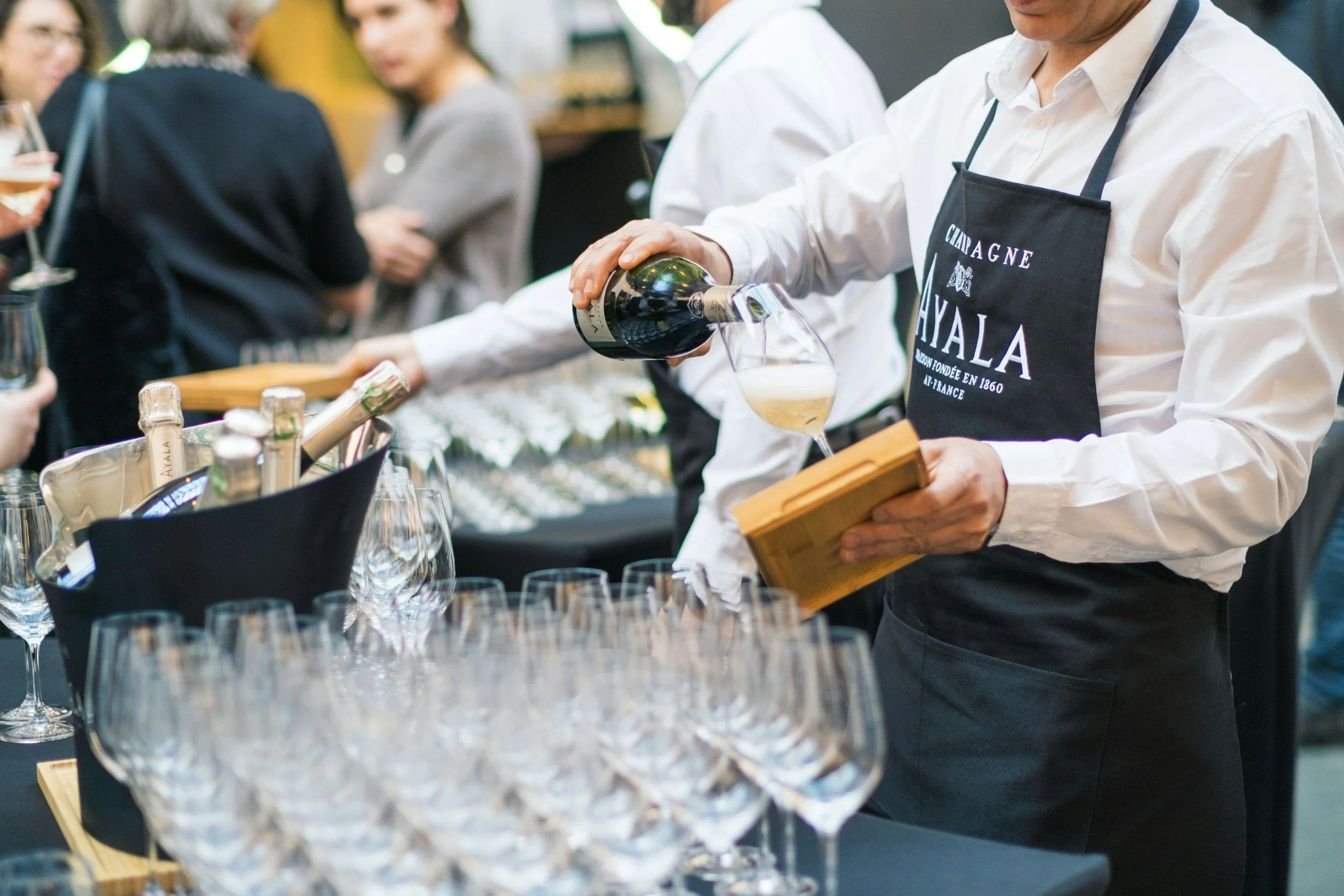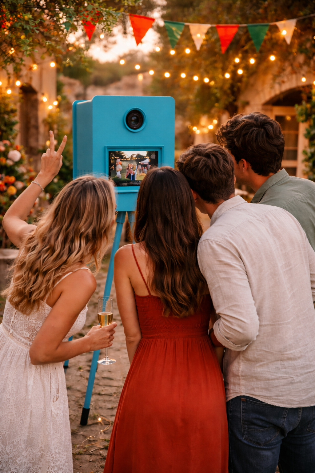 Gasten maken stijlvolle foto’s tussen glazen wijn, zachte verlichting en Italiaanse elegantie.